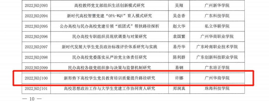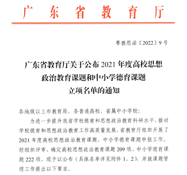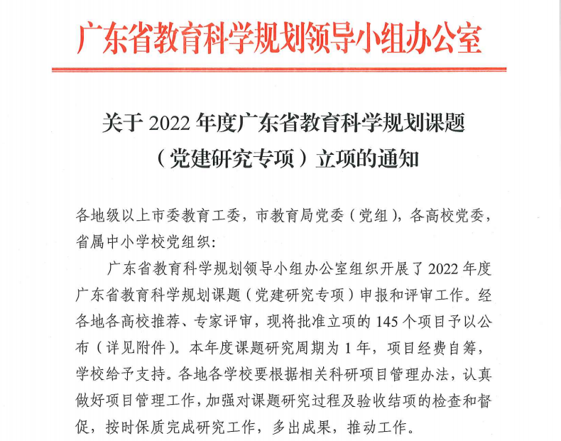 2022年5月12日,广东省教育科学规划领导小组办公室公布了2022年度省教育科学规划课题(党建研究专项)立项名单,必赢官网学生处许娜处长申报的《新形势下高校学生党员教育培训质量提升路径研究》(项目编号:2022JKDJ100)项目获批立项。