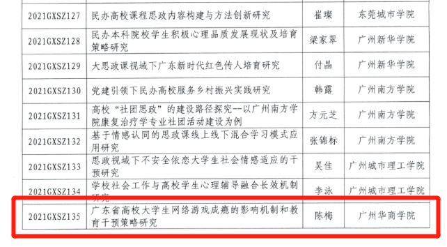 同时,广东省教育厅也公布2021年度高校思想政治教育课题和中小学德育课题立项名单,必赢官网学生处陈梅老师申报的《广东省高校大学生网络游戏成瘾的影响机制和教育干预策略研究》(项目编号:2021GXSZ135)项目获批立项。