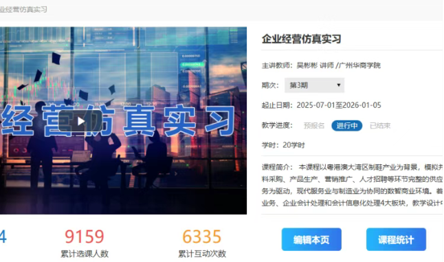 本课程以“数智赋能教学”为特色,融合了自主研发虚仿系统实现三维可视化自主经营,深度集成用友U8系统、RPA流程机器人、学银在线平台、虚拟仿真实验平台,实现教、学、管、评智能化创新。教学团队持续更新教学内容,创新教学方法,优化考核体系,突出“以学生发展为中心”的教学理念。课程开设十年来,已开展40期实训,累计培养经管类学生36878人,课程引领示范作用显著,国内外300多家高校与企业参观学习。《广州日报》《羊城晚报》《中国教育报》等多家媒体深度报道了课程的改革成效。课程先后荣获广东省教学成果一等奖、广东省教育数字化转型优秀案例二等奖、广东省高等学校教学管理学会优秀典型案例、广东省一流课程、广东省在线开放课程、广东省虚拟教研室等多项荣誉。