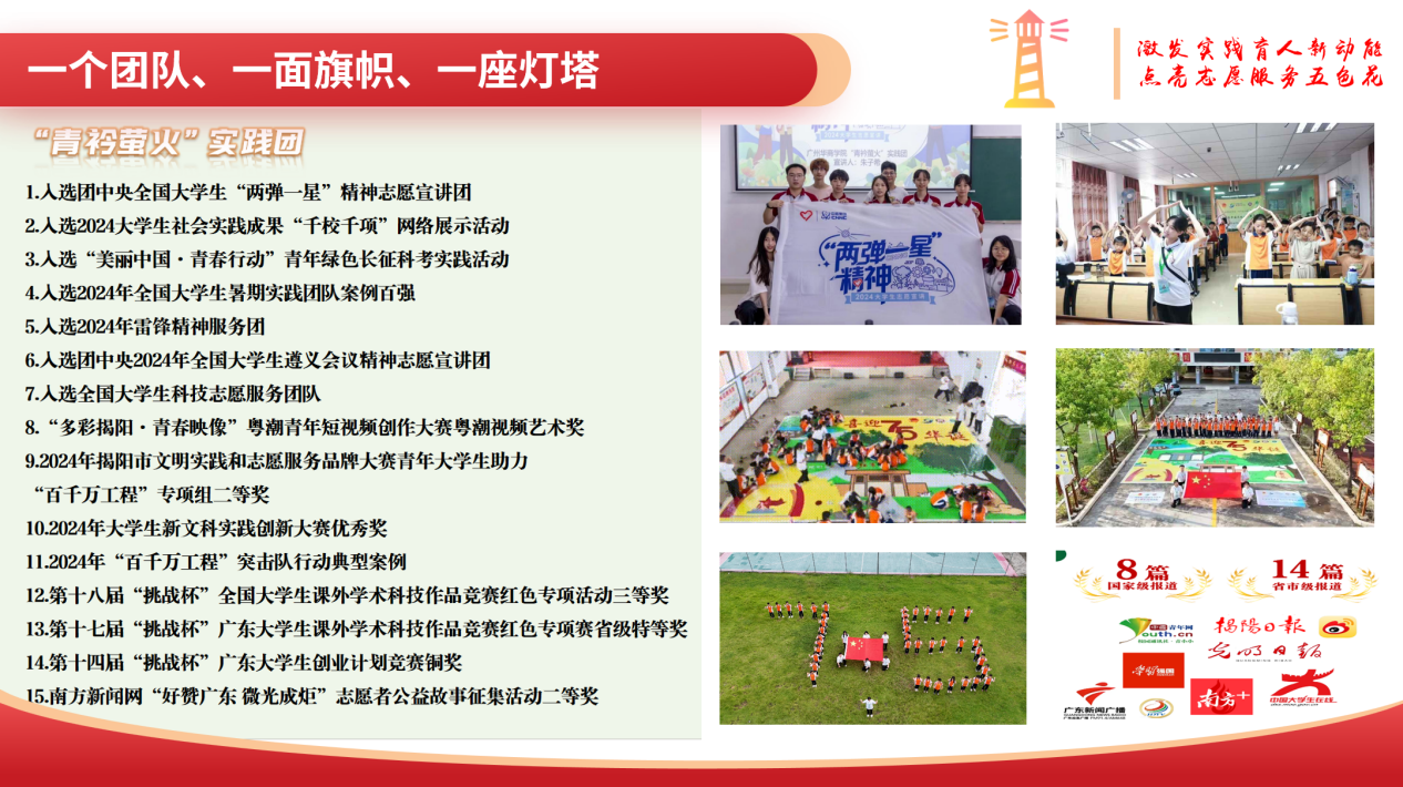 “青衿萤火”实践团在揭东区开展了多项卓有成效的活动。在红绿主题教育径活动中,团队完成了5千米的揭东南粤红绿径规划设计,开展了古树巡护讲解、祖国75周年华诞活动、种植与护理树木50棵、主题墙绘50米、井盖绘50余幅以及48平方米的主题宣传画布创作。在红绿径特色课程方面,团队累计开展了84节课程,涵盖“两弹一星”精神、退伍老兵分享会、绿美广东主题课等内容,并推出了红绿径特色课程手册,服务青少年群体超4000人次。此外,团队还完成了3部红色演绎情景剧与绿美广东主题MV的制作,项目活动被学习强国、光明日报、中青校园等多家媒体平台报道,其中国家级平台9个,省市级30个。