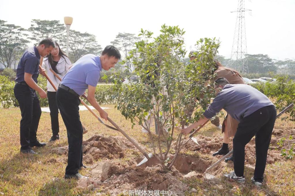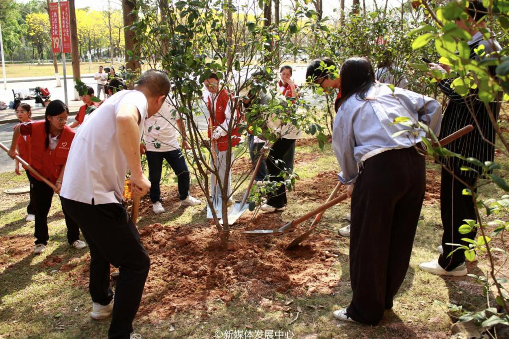 为引领华商青年在实践中践行绿色发展理念,助力绿美广东生态建设,3月11日-12日,437必赢会员中心2025年“绿美广东 青年先行”植树护绿活动在双校区开展。学校党委书记陈玉欢,校长助理黄伟新、张军,党委委员、党委办公室主任吕书勉,肇庆校区党委书记苏宁,国际学院院长回雁雁,创意与设计学院院长杨磊,管理学院副院长袁仕海,体育学院党总支副书记莫军,肇庆校区后勤保卫办公室主任徐强,党群部门负责人、校院两级团学骨干、教师代表及学生志愿者近400人参加本次活动。