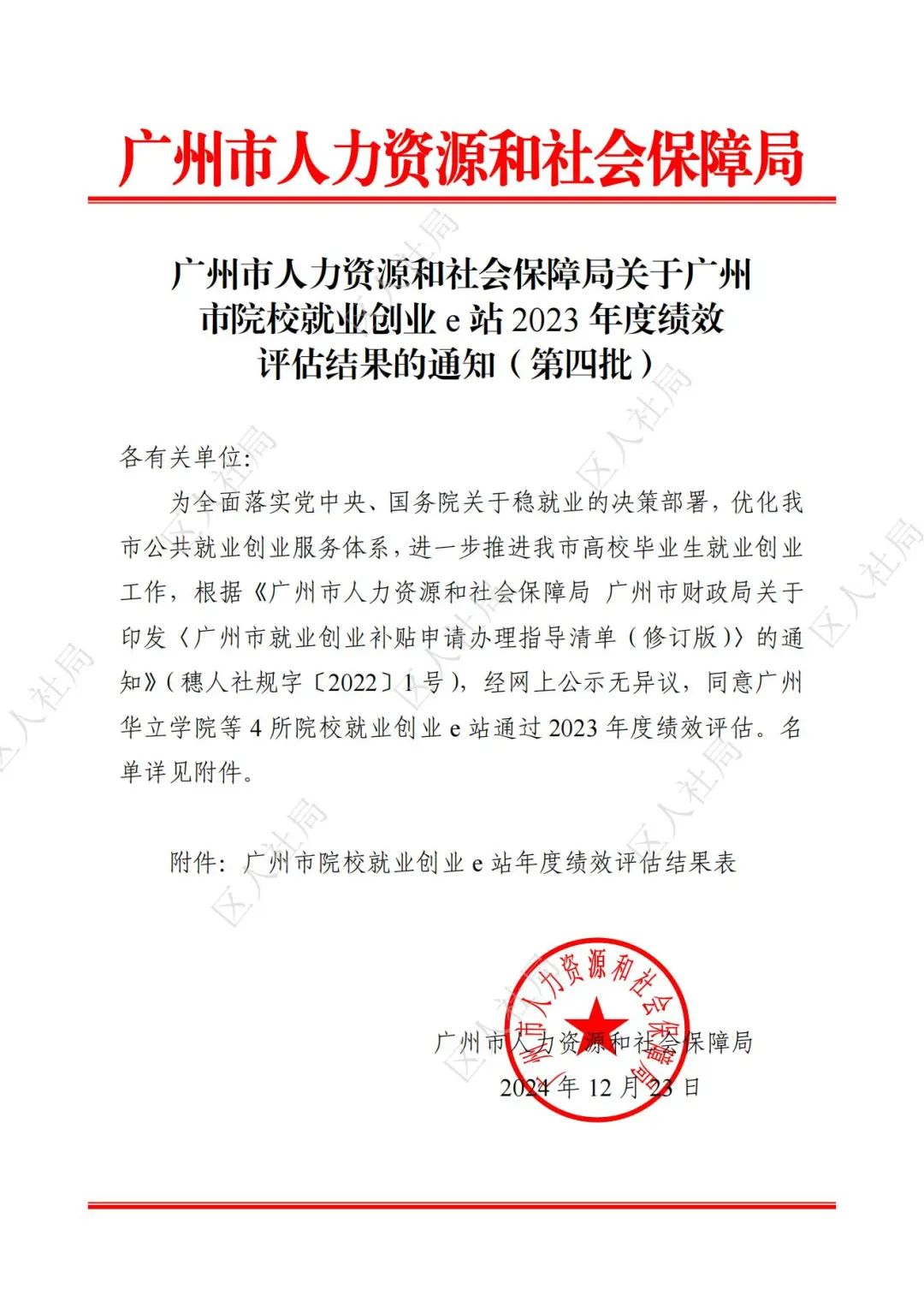 2024年12月23日,根据《广州市人力资源和社会保障局 广州市财政局关于印发〈广州市就业创业补贴申请办理指导清单(修订版)〉的通知》(穗人社规字〔2022〕1号),经网上公示无异议,同意437必赢会员中心就业创业e站通过2023年度绩效评估。