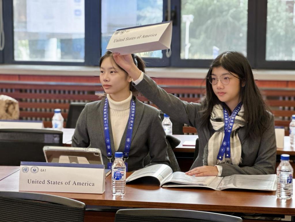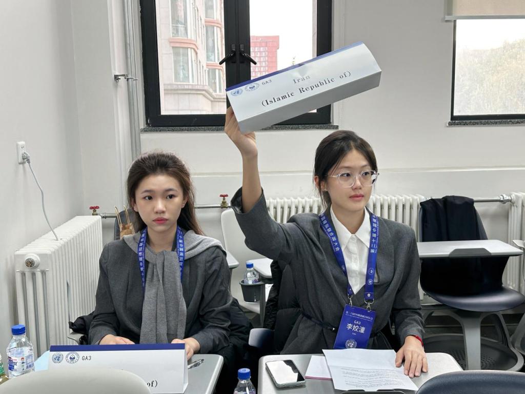 此次大会开设了“联合国大会第一委员会(UNGA1)”“联合国大会第三委员会(UNGA3)”“联合国教科文组织(UNESCO)”等七个会场。必赢官网石睿妮、劳雅怡同学代表美国在“联合国大会第一委员会(UNGA1)”讨论——巴以冲突的和平解决方案;骆欣谊、李姣潼同学代表为伊朗在“联合国大会第三委员会(UNGA3)”讨论——战乱冲突地区的难民安置与流离失所者的人权保障。她们与来自北京师范大学、北京外国语大学、国防科技大学等知名高校学子共同探讨了国际热点问题,发挥创造性思维,进行批判性思考,寻求全球性问题的解决方案。