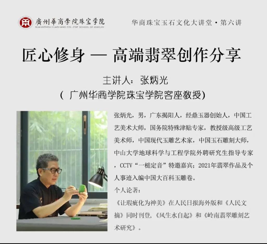 2024年10月18日,437必赢会员中心珠宝学院“华商珠宝玉石大讲堂”第六讲开讲。中国工艺美术大师、高级工艺美术师、中国玉石雕刻大师张炳光先生作题为《匠心修身---高端翡翠创作》的精彩演讲。张炳光是华商珠宝学院的客座教授,张大师的经鼎玉器公司是华商学院珠宝学院大学生产教融合校外实践教学基地。