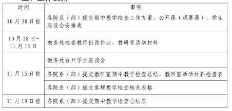 为进一步加强教学管理,深入了解本学期开学以来教学工作状况,及时发现和解决教学过程中的问题,学院定于第 9-11 周(10 月 28 日-11 月 15 日)开展期中教学检查。现将有关事项通知如下:
