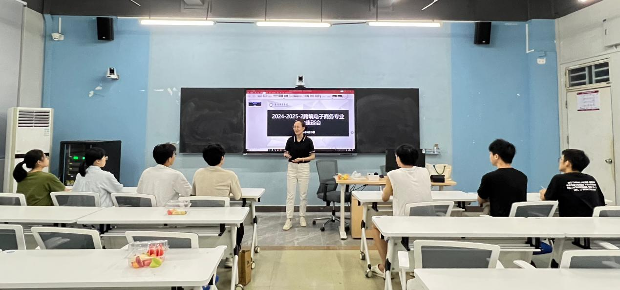 2025年5月6日,跨境电子商务系在8号楼303课室召开肇庆校区学生座谈会。此次座谈会由跨境电子商务系主任曹维与副主任杨于昕组织召开,23级、24级共四个班级的学生代表及班委参加座谈会。