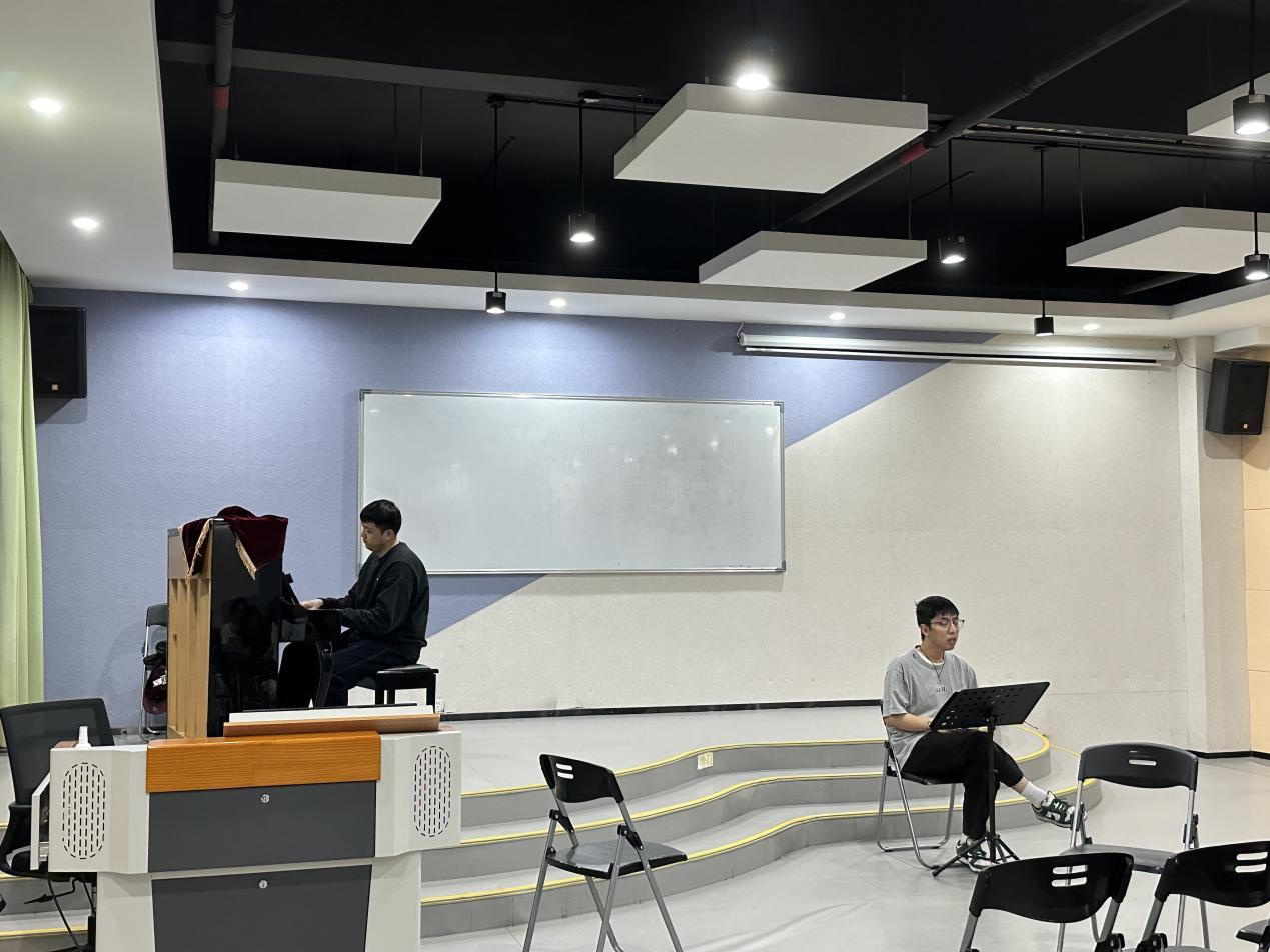 讲座伊始,黄俊凯老师从合唱艺术的发展历史讲起,生动讲解了和声在合唱中的重要性。他以不同时期经典合唱作品为例,剖析不同风格的合唱技法,并结合自身多年的实践经验,分享了如何在合唱排练中提升音准、音色及团队协作能力。现场观众沉浸在悠扬和谐的旋律中,深刻体会到合唱的独特魅力。同时,陆定坤老师现场以钢琴精彩演绎了部分作品,其精湛的技艺与深情的表达深深打动了在场的每一位学生,赢得了一致好评和热烈掌声。