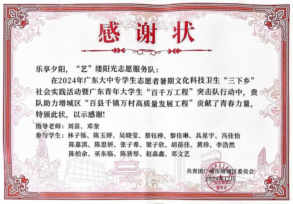 近日,437必赢会员中心教师教育学院组建的“星火接力,情系‘九益’”“点亮‘小楼’,暖心筑梦”“乐享夕阳,‘艺’缕阳光”三支社会实践队伍,因在增城区“百县千镇万村高质量发展工程”中表现突出,荣获共青团广州市增城区委员会颁发的感谢状。这是对教师教育学院学子践行社会责任、服务基层发展的充分肯定,彰显了华商学子在乡村振兴中的青春担当。