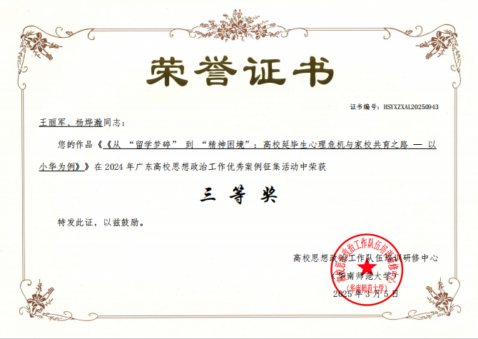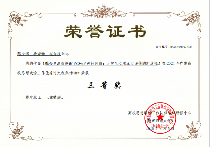 陈少鸿、杨烨瀚、湛秀枝合作的论文《融合多源数据的PSO-BP神经网络:大学生心理压力评估的新途径》荣获优秀论文“三等奖”。该研究通过技术创新精准评估学生心理状态,为心理健康干预提供科学依据。王丽军、杨烨瀚的案例《从“留学梦碎”到“精神困境”:高校延毕生心理危机与家校共育之路》荣获“三等奖”,通过真实案例剖析家校协同机制在心理危机干预中的关键作用。王蓓的案例《打破僵局,共筑“雅”舍——新时期高校宿舍文化建设个案探究》荣获“优秀奖”,聚焦宿舍文化育人功能,探索学生社区管理新模式。