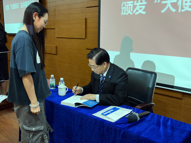 本场讲坛还特别安排了签名赠书环节。何昌垂院士结合多年科技和外交工作经验撰写了多部与粮食安全、国际事务、国际组织的专著,他非常热情而认真地为现场要求签名的同学在书籍写上鼓励的话语。
