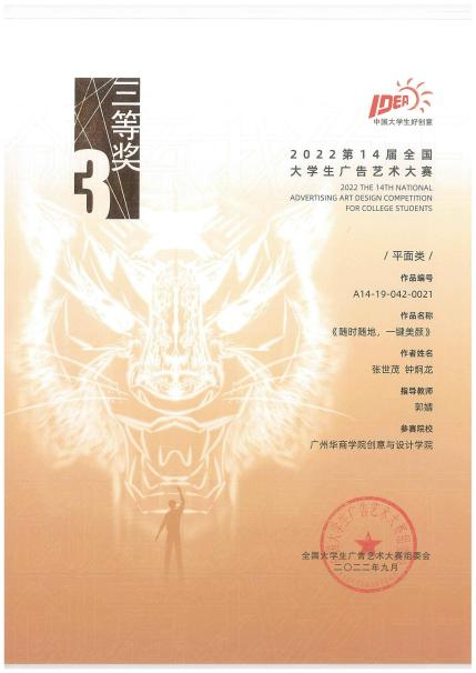 自2016年创意与设计学院积极组织师生参加各类学科竞赛,尤其是在全国大学生广告设计大赛中保持成绩连年攀升的强劲势头。近三年更是取得突破性进展:全国赛方面,2022年获三等奖4项、优秀奖12项;2023年斩获二等奖1项、三等奖3项、优秀奖8项;2024年实现历史性突破,摘得一等奖2项、三等奖5项、优秀奖10项。广东赛区同样表现抢眼:2022年包揽一等奖18项、二等奖40项、三等奖42项;2023年收获一等奖13项、二等奖14项、三等奖24项;2024年再创新高,一举夺得一等奖31项、二等奖39项、三等奖31项。这些骄人成绩正是必赢官网创意与设计学院深化“以赛促教”、践行“艺商融合”人才培养模式的最佳印证。